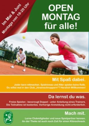 Übrigens: Nachdem bereits in den vorangegangenen Jahren unser „Open Montag“ sehr gut angenommen wurde, werden wir auch in diesem Jahr wieder einen offenen Trainingstag unter Anleitung unseres Trainers Kilian anbieten. Jeden Montag im Mai und Juni ist die Anlage von 18-20 Uhr für Neu-Mitglieder, Schnupperer und andere Tennis-Interessierte offen. Aufgrund des Feiertages am 1. Mai geht es dieses Jahr am 8. Mai los.