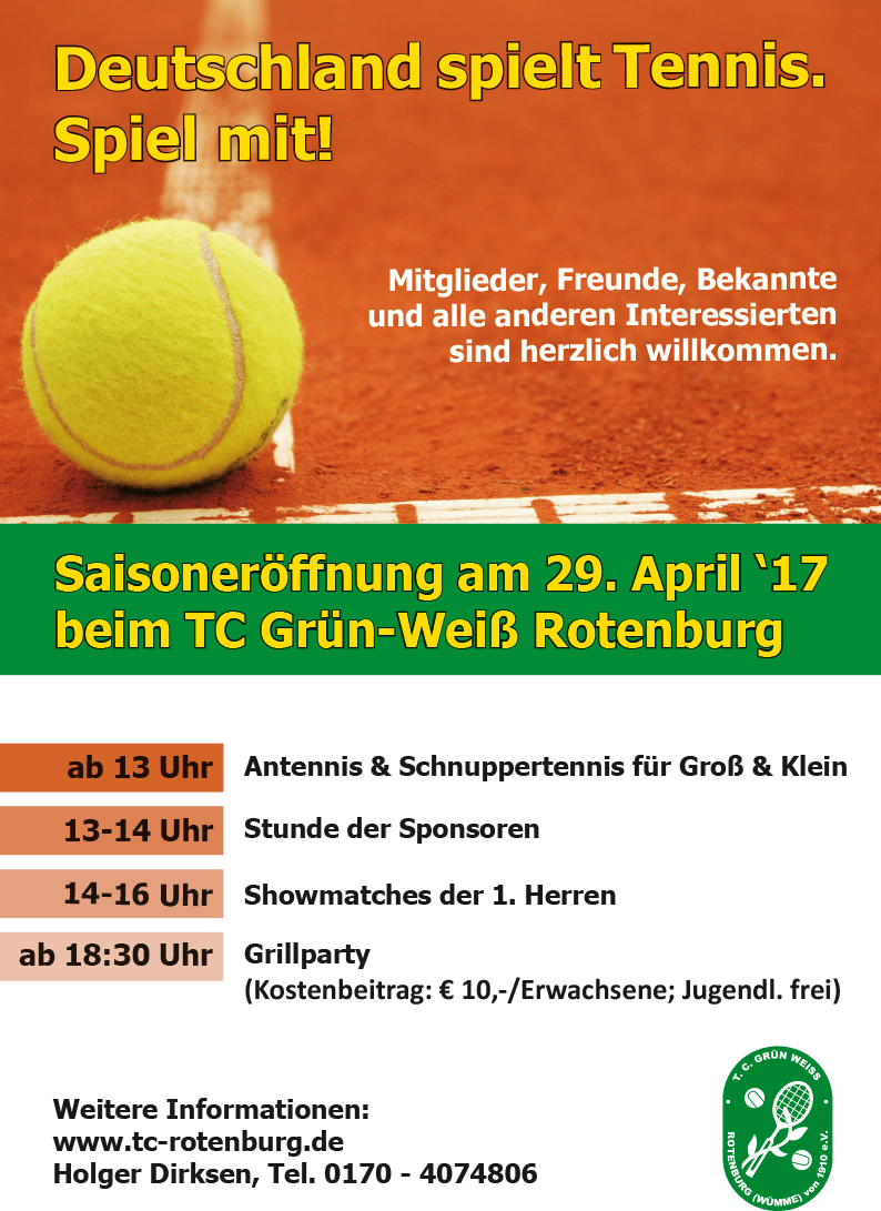 Außerdem sind eure Freunde, Bekannte und alle am Tennissport Interessierten ebenso herzlich willkommen – sei es, um selbst das Spiel mit der Filzkugel auszuprobieren oder um einen netten Klönschnack auf der Anlage zu halten. Damit sich alle wohlfühlen wird für Kaffee und Kuchen am Nachmittag gesorgt sein und auch die Theke ist mit einer großen Getränkeauswahl am Start.