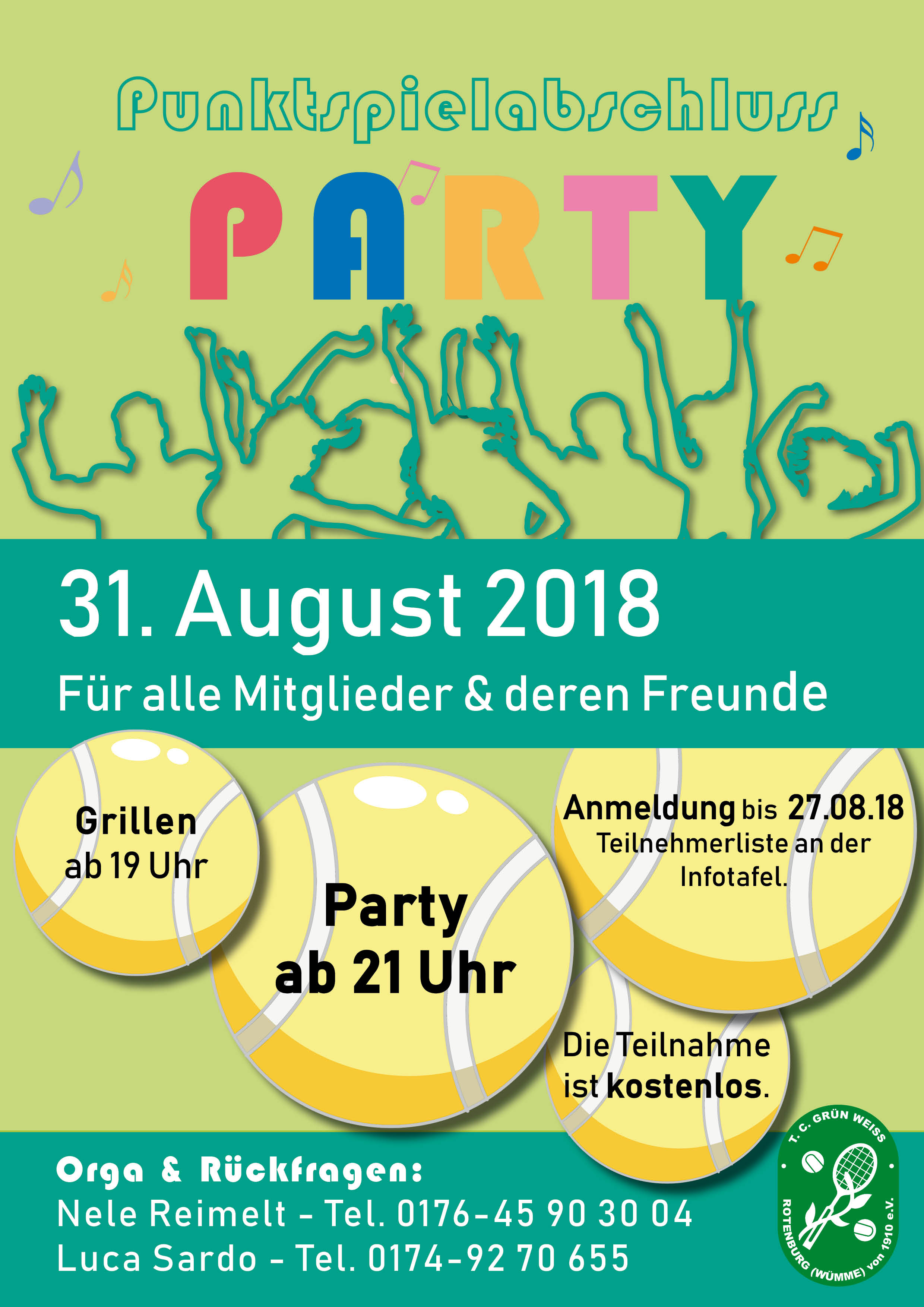 Zur besseren Planung für die Organisatoren Luca und Nele hängt eine Anmeldeliste an der Infotafel im Clubhaus. Bitte tragt euch hier bis zum 27. August ein. Natürlich könnt ihr aber spontan mitfeiern.