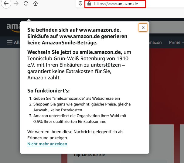 Das war’s schon. Ihr müsst dann nur noch darauf achten, euch am Web-Browser über den Link https://smile.amazon.de bei Amazon einzuwählen. Die Voreinstellungen im Amazon.Smile-Programm bleiben erhalten. Sollte ihr einmal nicht daran denken und direkt über amazon.de auf Amazon gehen, erhaltet ihr eine automatisch eine Erinnerung an Amazon.Smile: