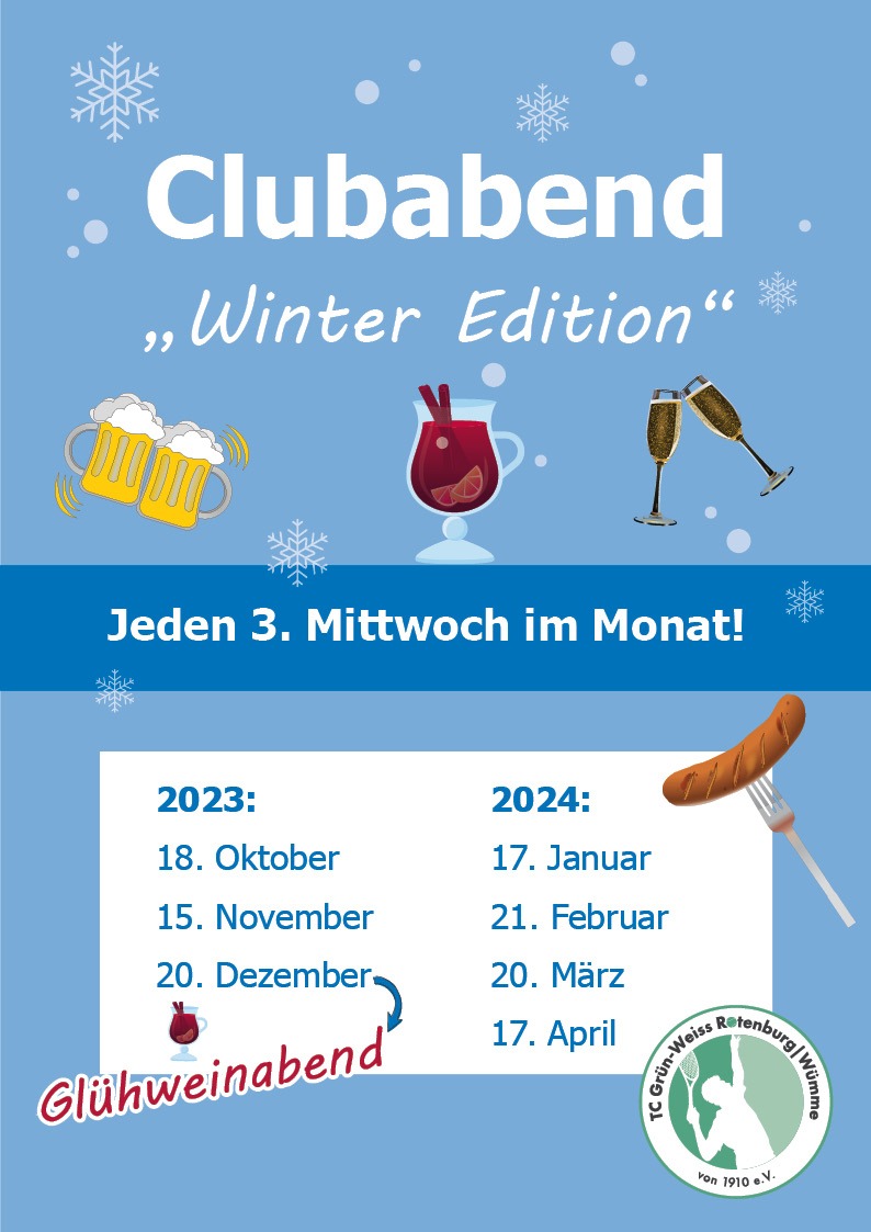 Natürlich geht’s auch in der Wintersaison mit unserem Clubabend weiter. Jeden dritten Mittwoch im Monat sind wir mit Getränken und Bratwurst für euch da.