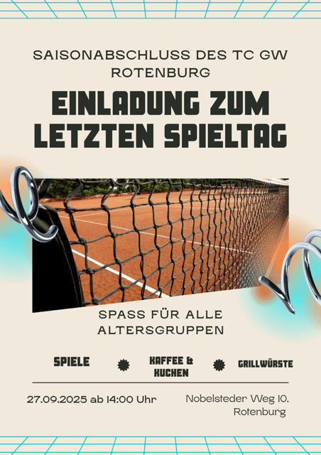 Der Herbst und damit die Wintersaison steht vor der Tür. Doch bevor es in die Halle geht, möchten wir die Outdoor-Saison am 27. September bei unserer Abtennis-Veranstaltung gemütlich mit euch ausklingen lassen. Ab 14 Uhr geht’s los.