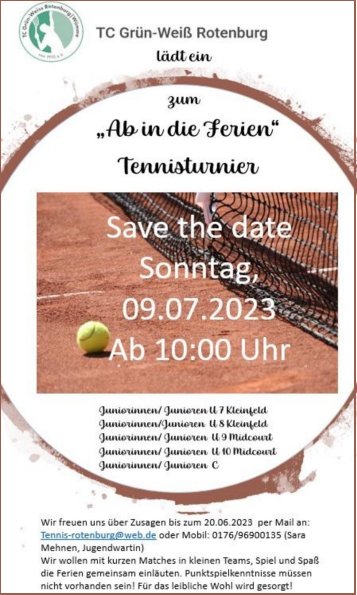 Rückfragen und Anmeldungen bitte über unsere Jugendwartin Sara Mehnen: tennis-rotenburg@web.de bzw. Tel. 0176/96900135.