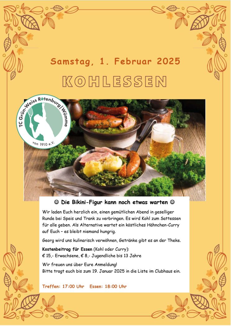 Wir laden Euch herzlich ein, am 1. Februar 2025 einen gemütlichen Abend in geselliger Runde bei Speis und Trank zu verbringen. Es wird Kohl zum Sattessen für alle geben. Als Alternative wartet ein köstliches Hähnchen-Curry auf Euch – es bleibt niemand hungrig.