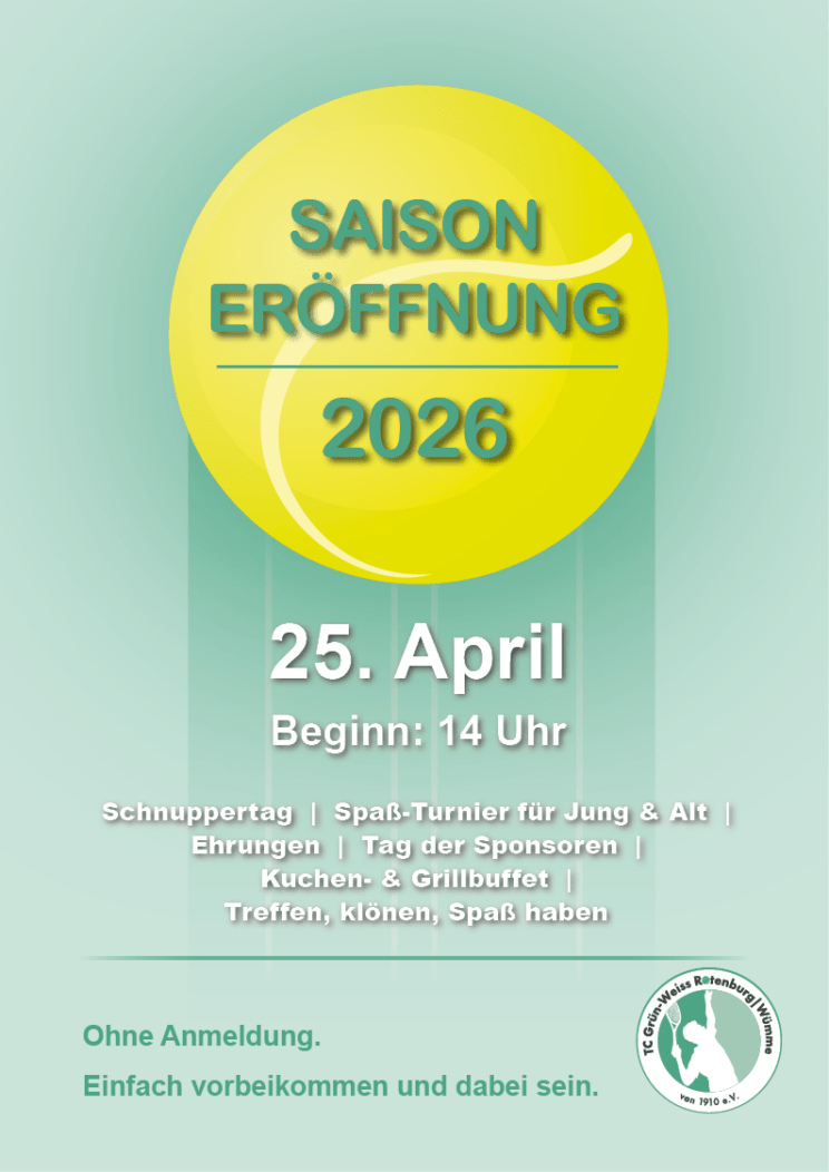 Freut ihr euch auch schon so sehr auf die Freiluftsaison? Am 25. April ab 14 Uhr ist es soweit und es geht wieder raus auf die rote Asche. Seid dabei, bringt gern Freunde und Bekannte mit und genießt einen entspannten Tag auf unserer Anlage.