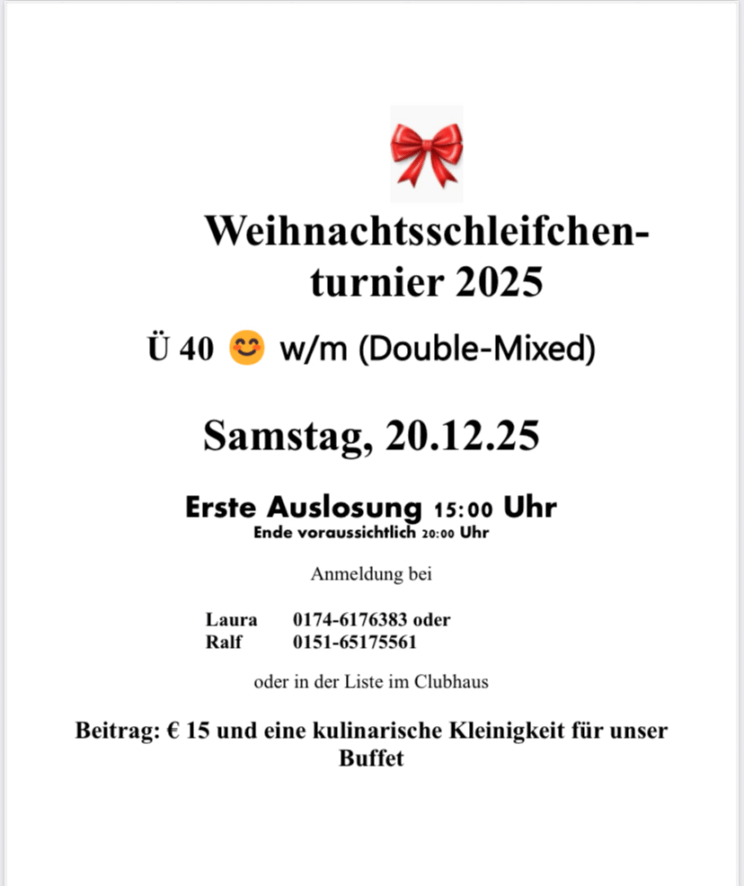 Kurz vor den Feiertagen findet wieder unser beliebtes Weihnachtsturnier für Spielerinnen und Spieler ab 40 Jahren statt. Das Schleifchenturnier findet im Mixed-Doppelmodus statt, wobei die Paarungen in jeder Runde neu zugelost werden. Spaß ist garantiert!
